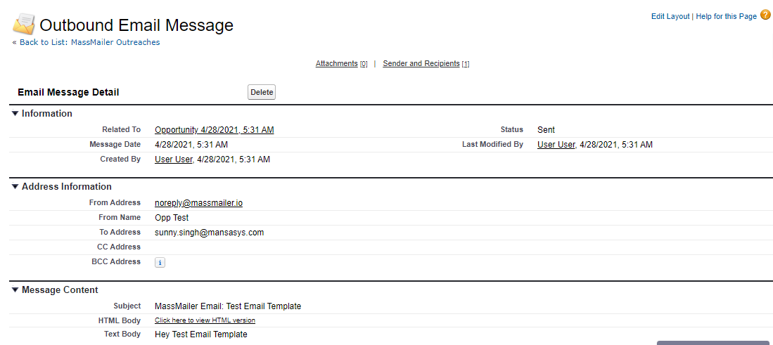 Activity history is captured on the Contact object for all emails sent via MassMailer.